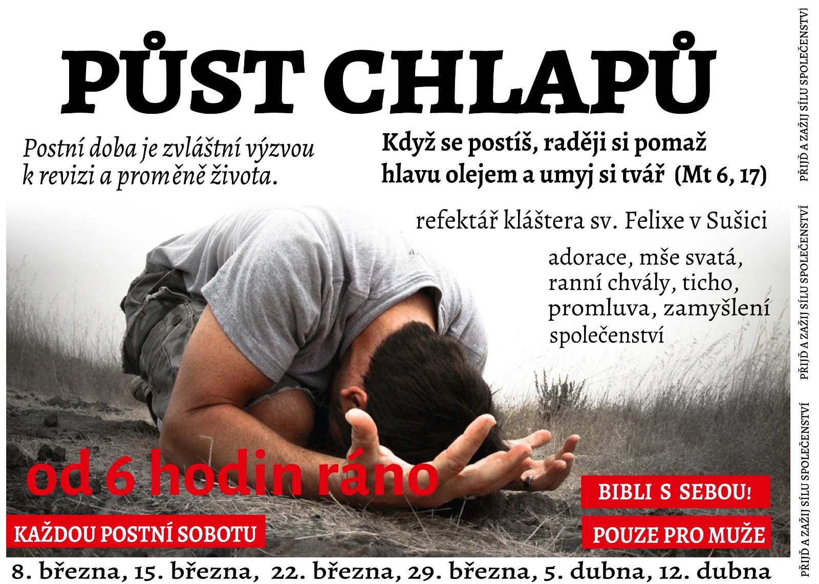 O postních sobotách jsou všichni chlapi zváni do sušického kapucínského kláštera. Sraz je v 5.59 h před kostelem sv. Felixe, aby se v 6 h mohlo začít v refektáři, popř. v krbovce kláštera. A s čím? Na programu je společná modlitba ranních chval, četba Písma a sdílení. V letošním roce se nabízejí mimo jiné i tato témata k promýšlení: postní doba, modlitba, služba a charita, pokání, svoboda v Kristu, vděčnost a radost, pravý muž… Poté bývá čas na tichou adoraci před eucharistickým Kristem. A v 8 h začíná v kostele pravidelná sobotní mše sv. Po liturgii je prostor na agapé.